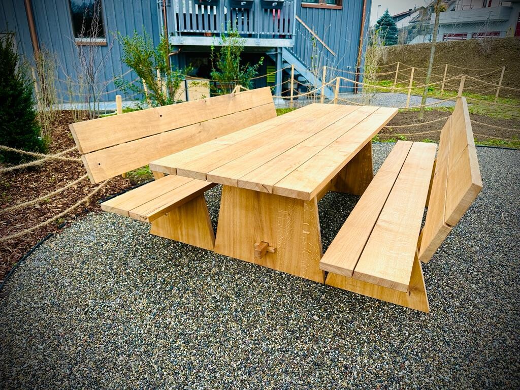 Nebst Balken und Brettern biete ich auch Möbel aus Massivholz für den Aussenbereich an. Gefertigt werden die Tische, Bänke etc. wahlweise aus Eiche, Lärche oder Douglasie. Diese Holzarten sind besonders witterungsbeständig und langlebig.